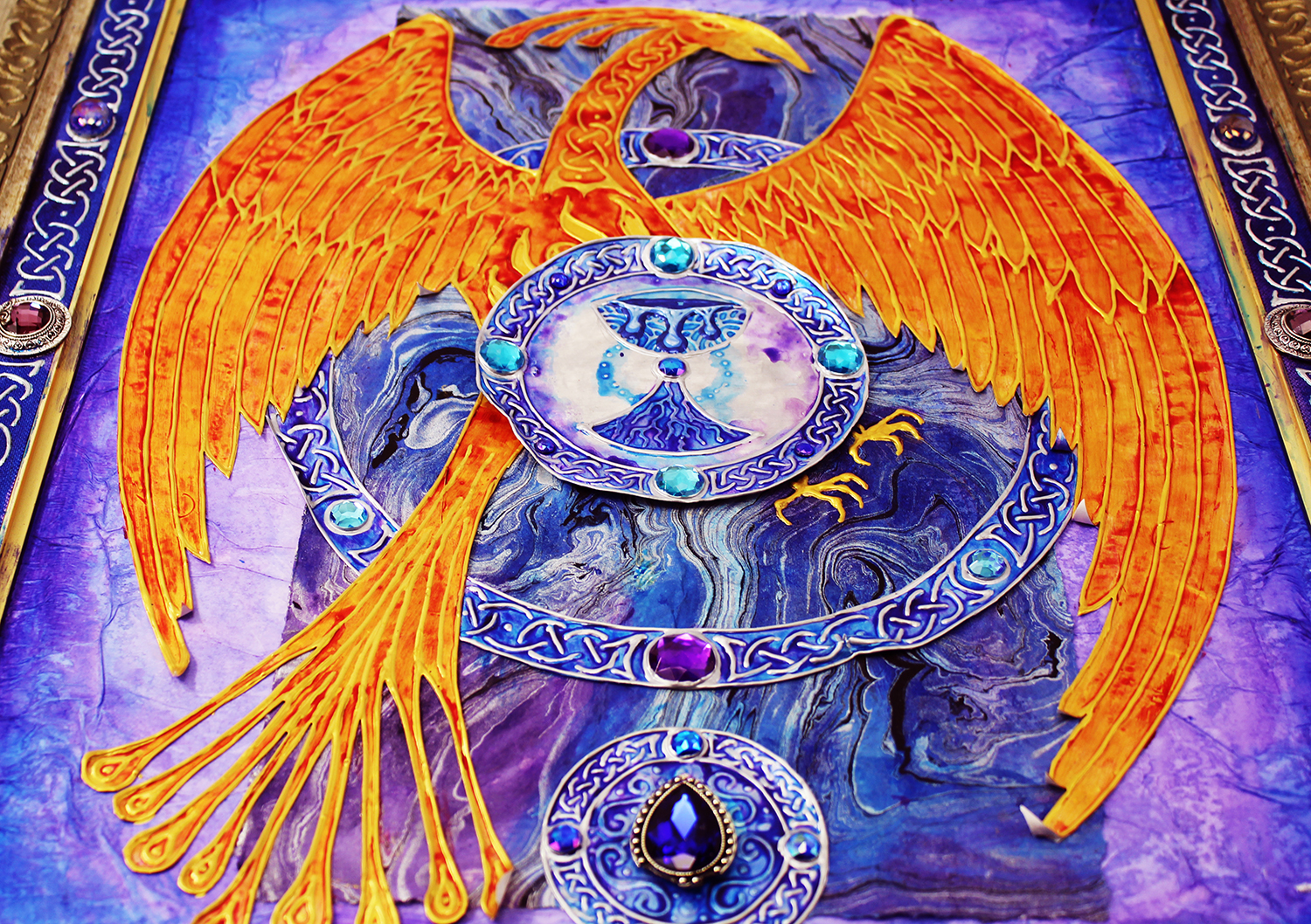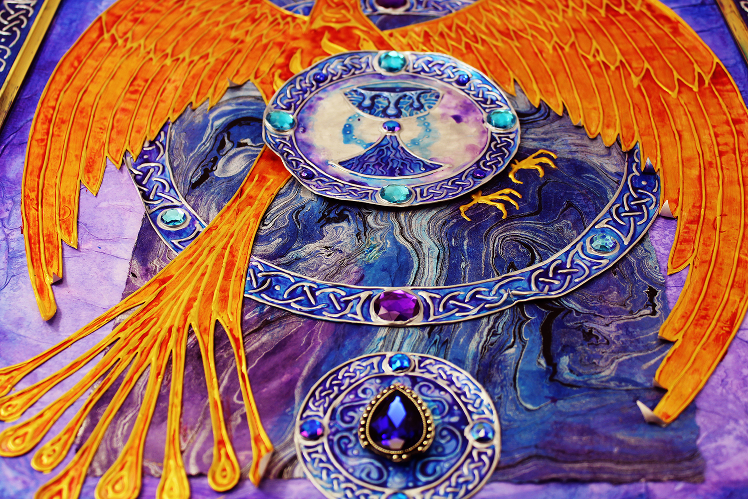 Gold and silver paint, tissue paper, acrylics, watercolors, textured paper, jewels, charms, metal objects.