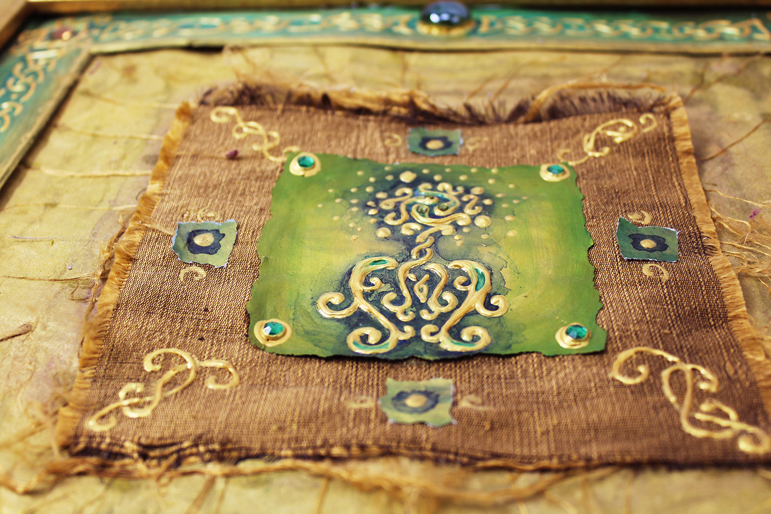 Gold and silver paint, tissue paper, acrylics, watercolors, textured paper, jewels, charms, metal objects.