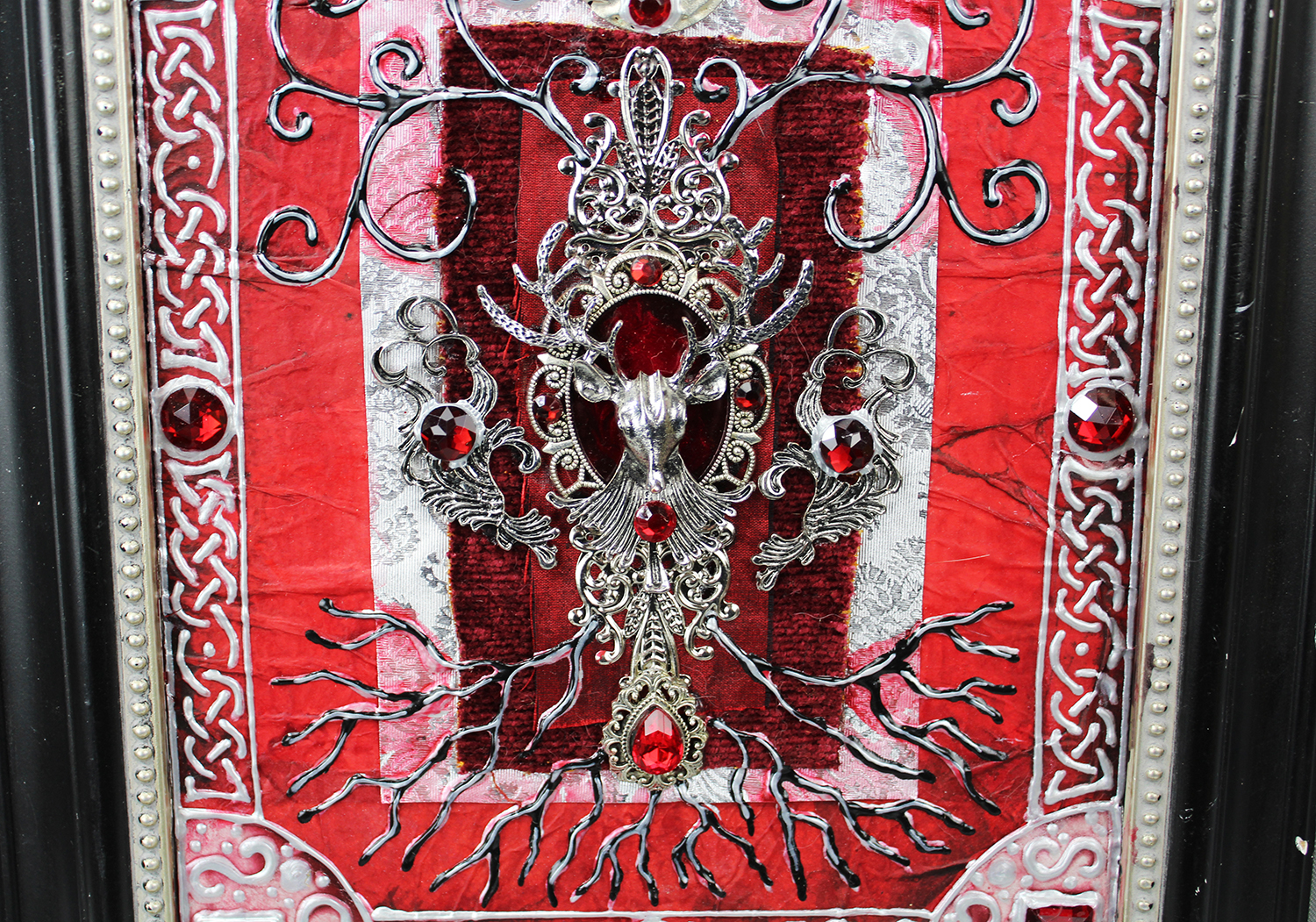 Gold and silver paint, tissue paper, acrylics, watercolors, textured paper, jewels, charms, metal objects.