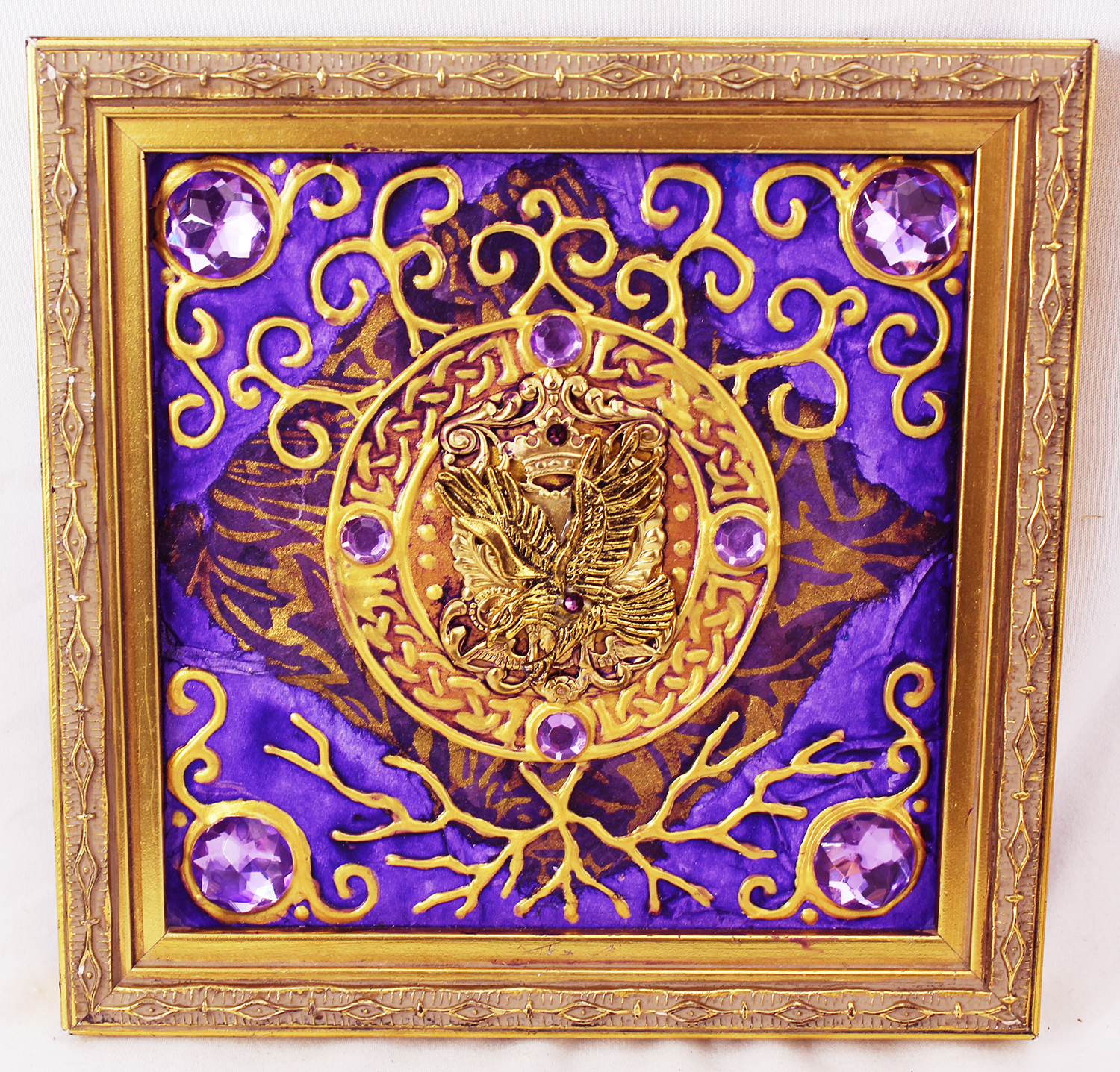Gold and silver paint, tissue paper, acrylics, watercolors, textured paper, jewels, charms, metal objects.