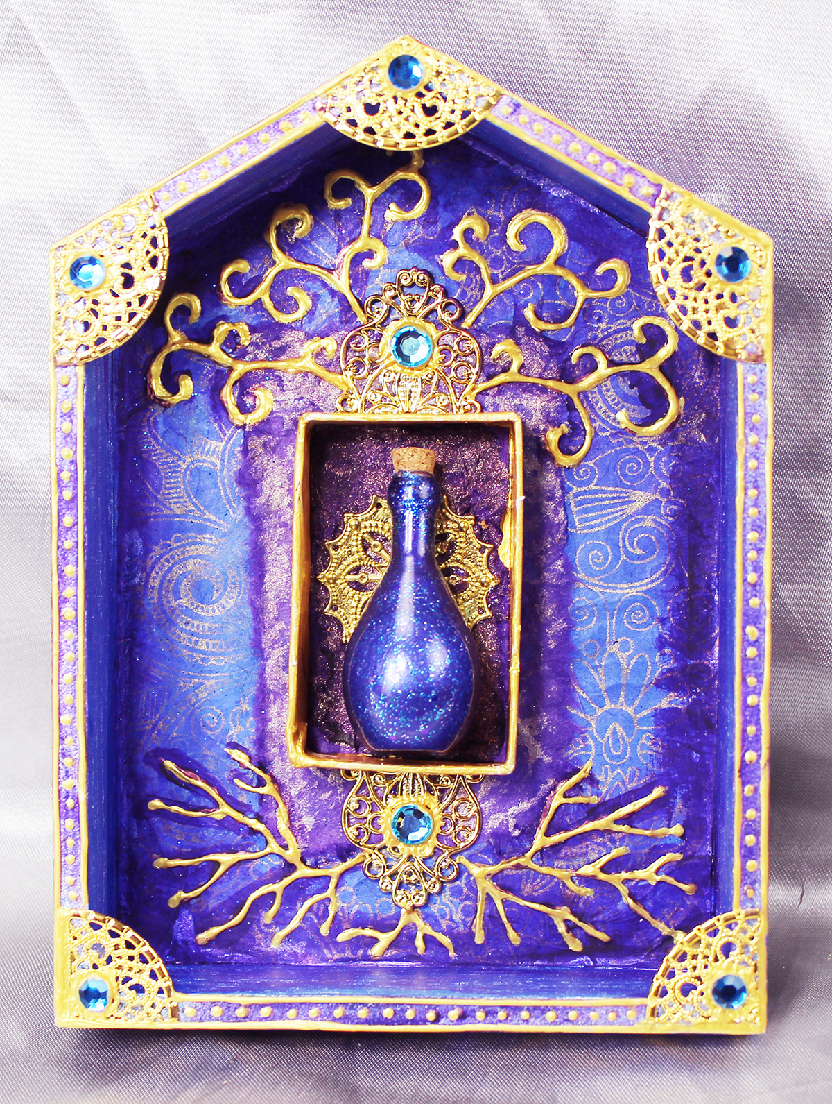Gold and silver paint, tissue paper, acrylics, watercolors, textured paper, jewels, charms, metal objects.