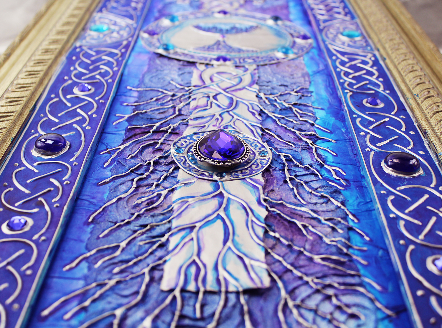 Gold and silver paint, tissue paper, acrylics, watercolors, textured paper, jewels, charms, metal objects.
