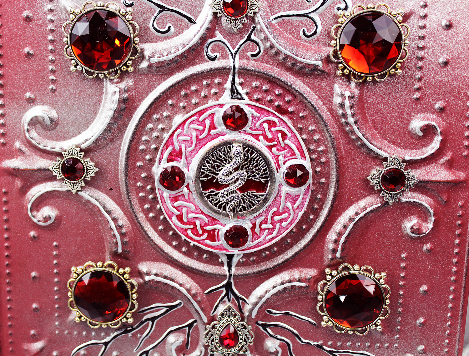Gold and silver paint, tissue paper, acrylics, watercolors, textured paper, jewels, charms, metal objects.