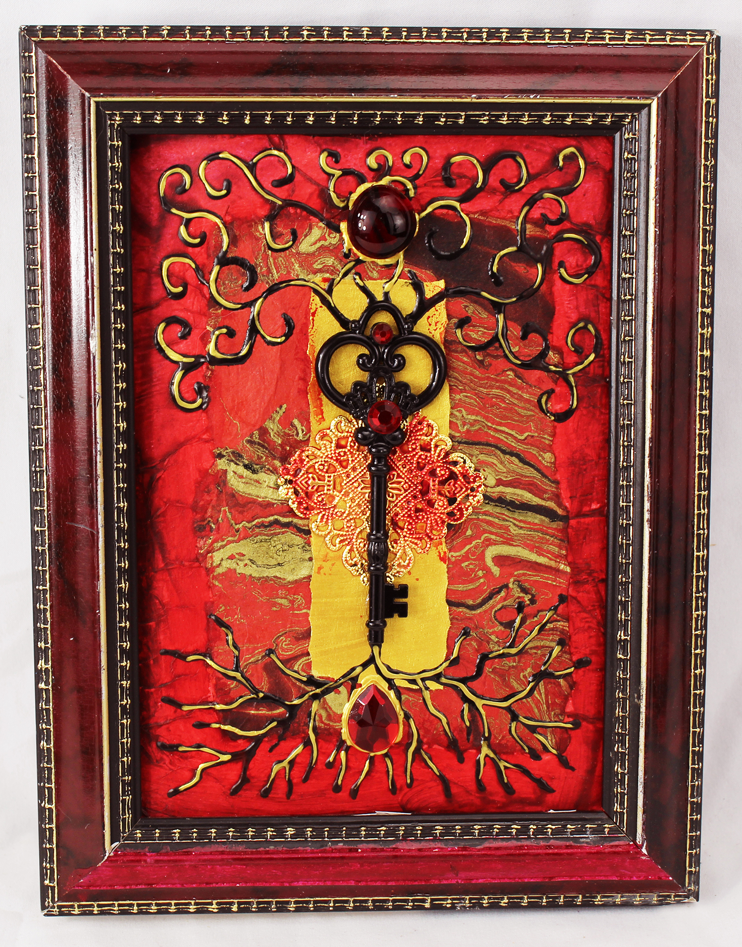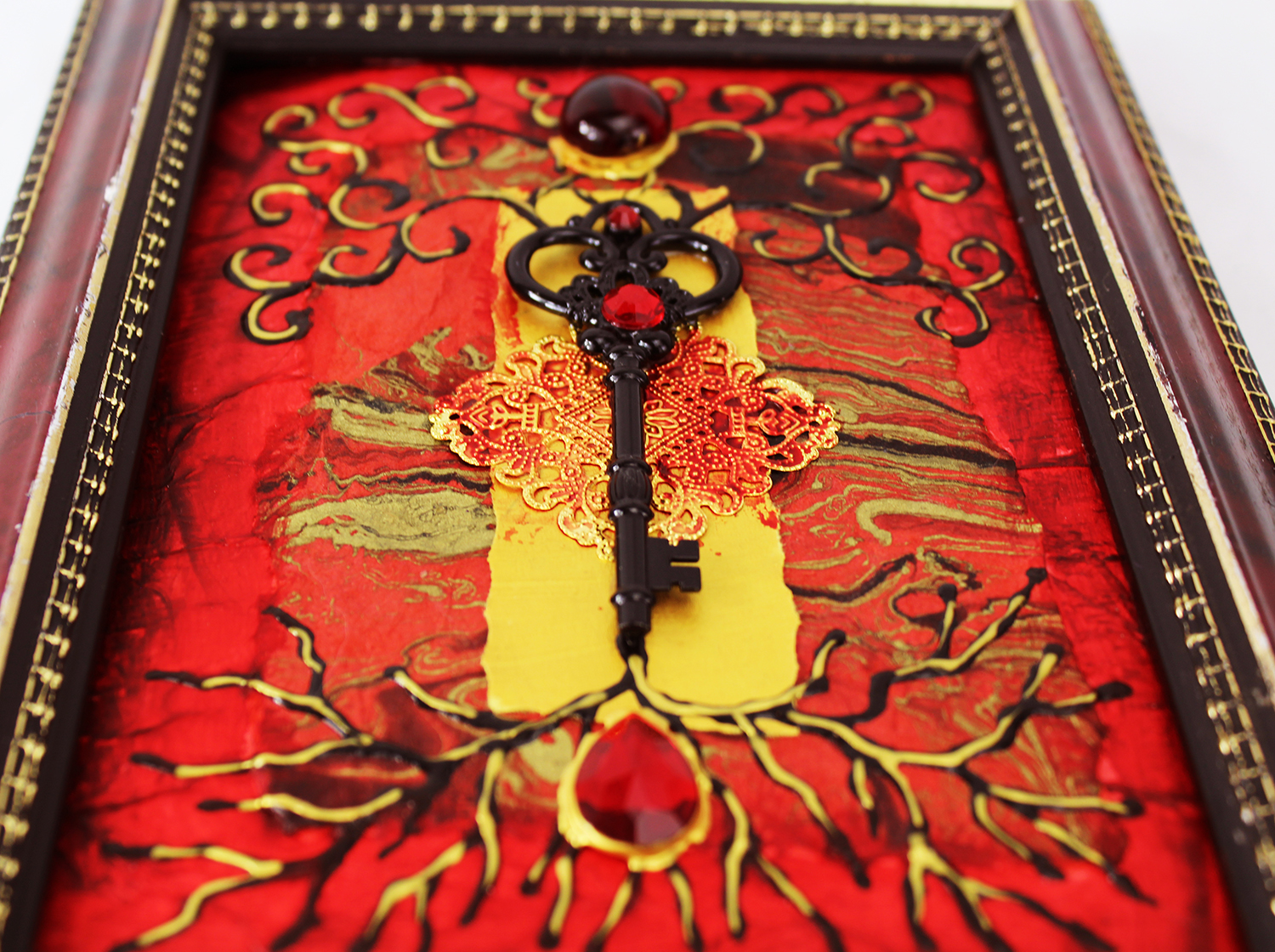 These pieces are created from layered and textured paint, paper, fabric, and other with raised gold or silver paint to create the design. The frame is included.
