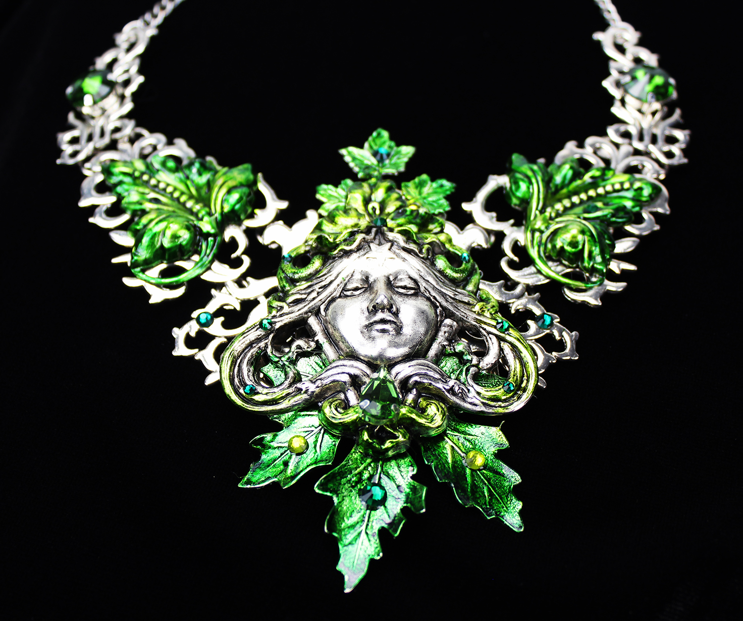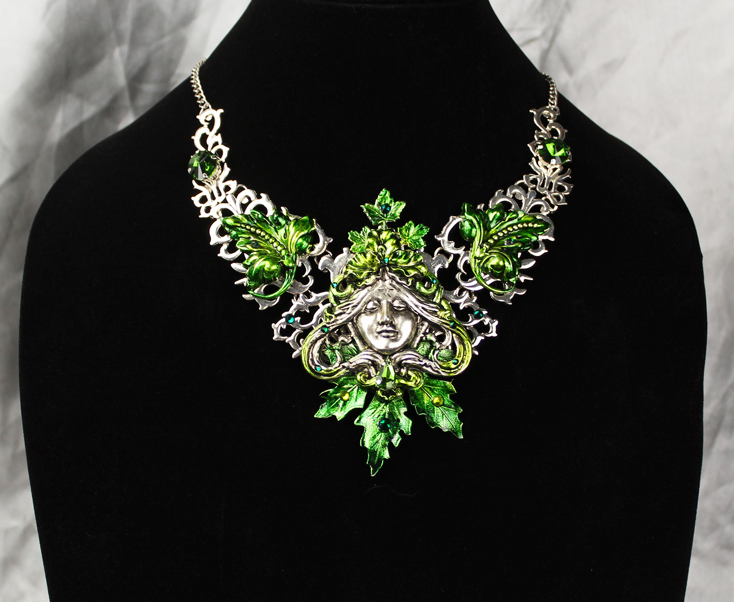 Woman Goddess Leaves Necklace in Green and Silver (large)