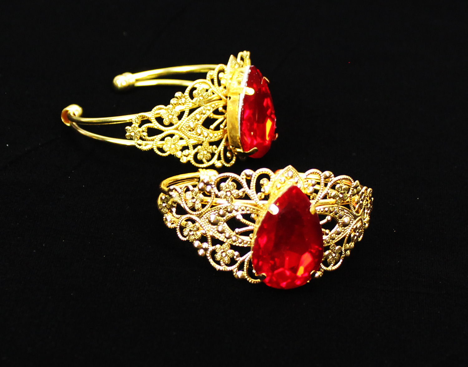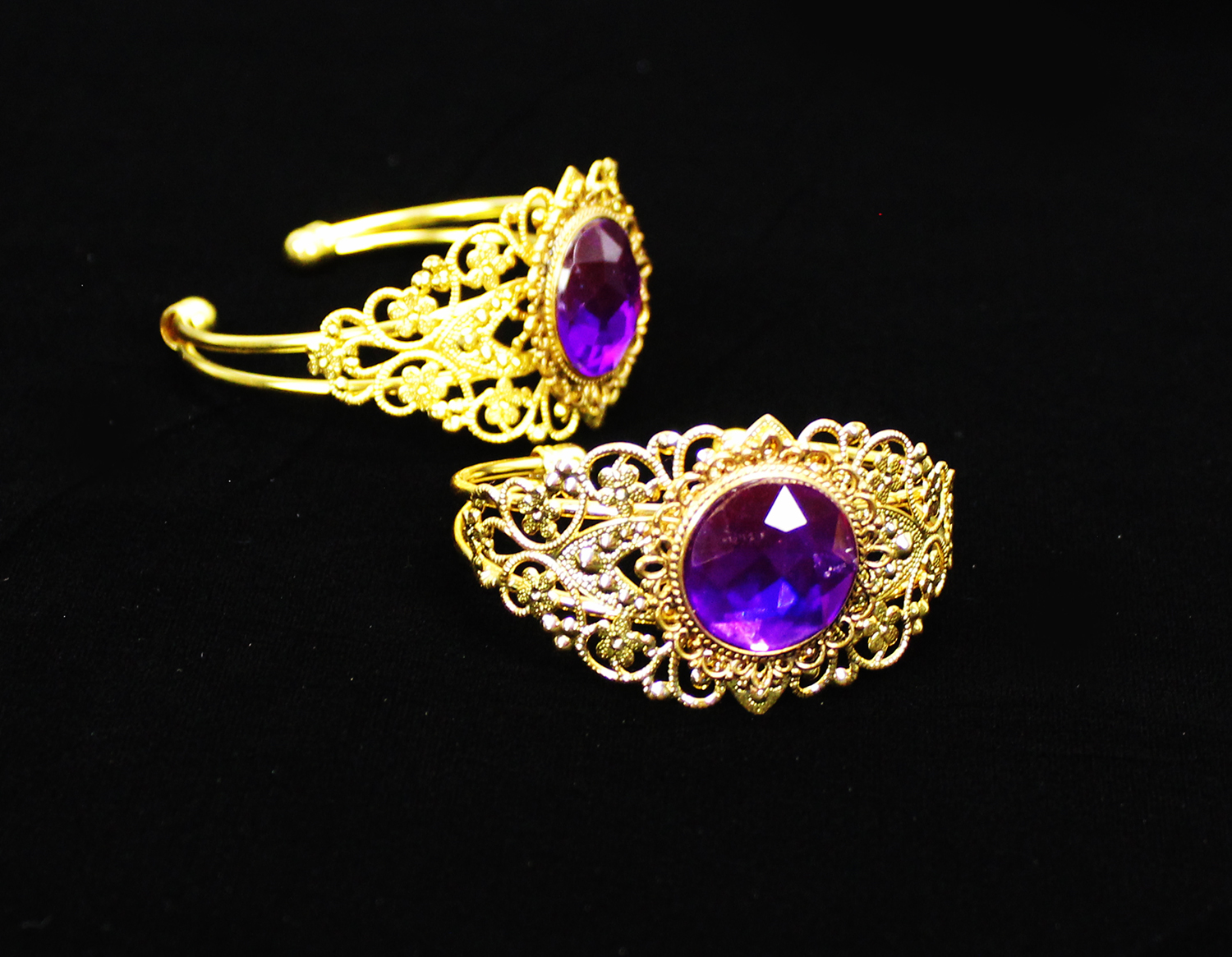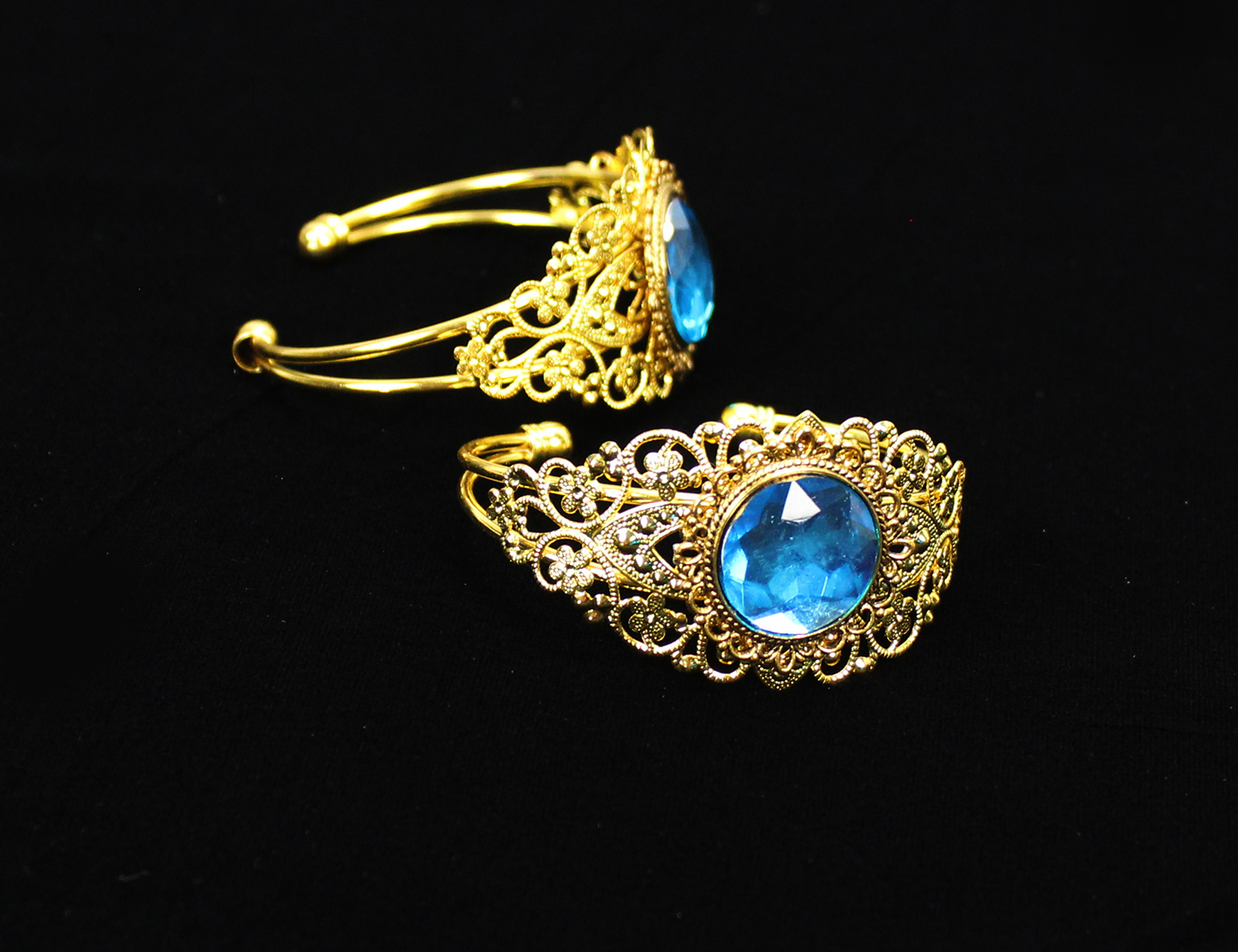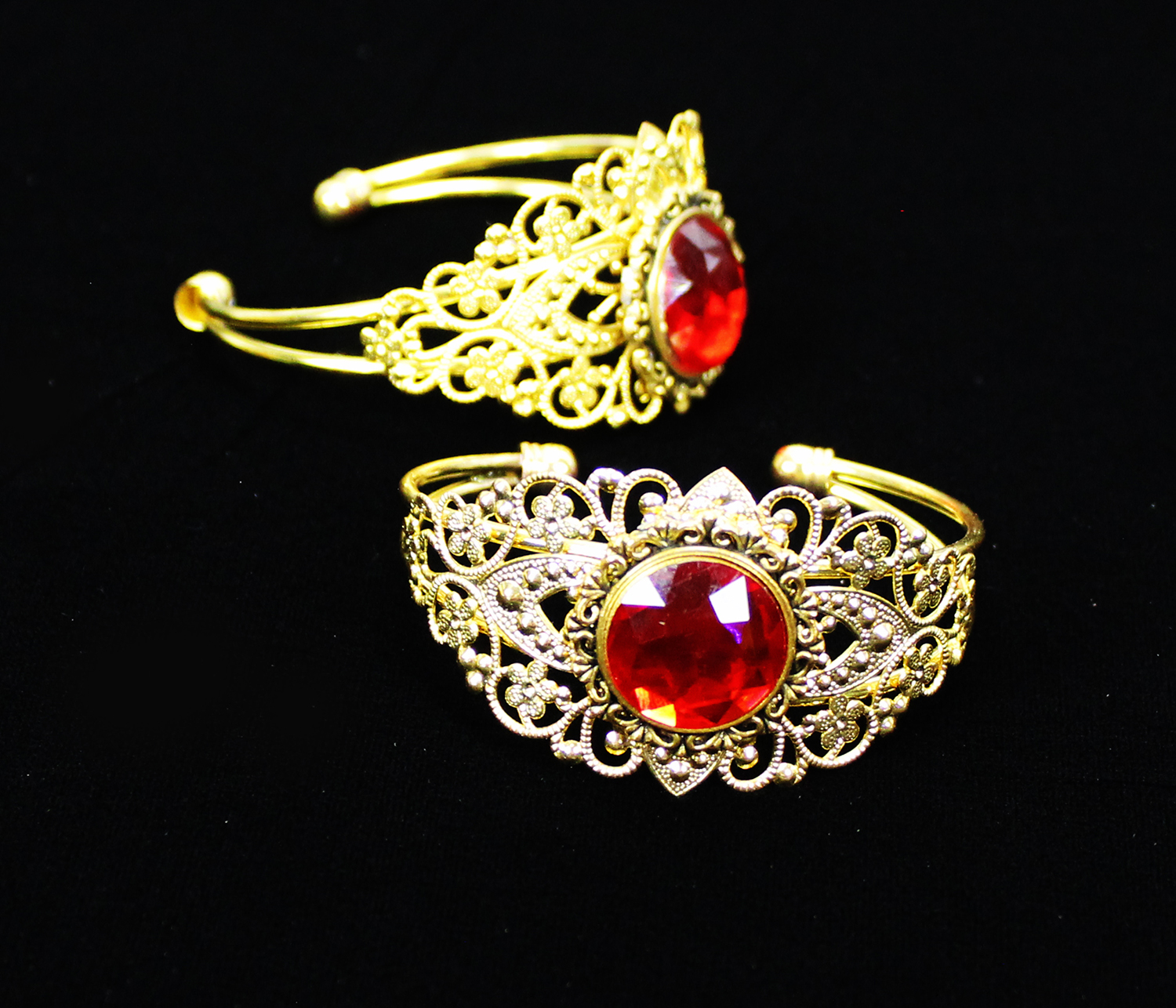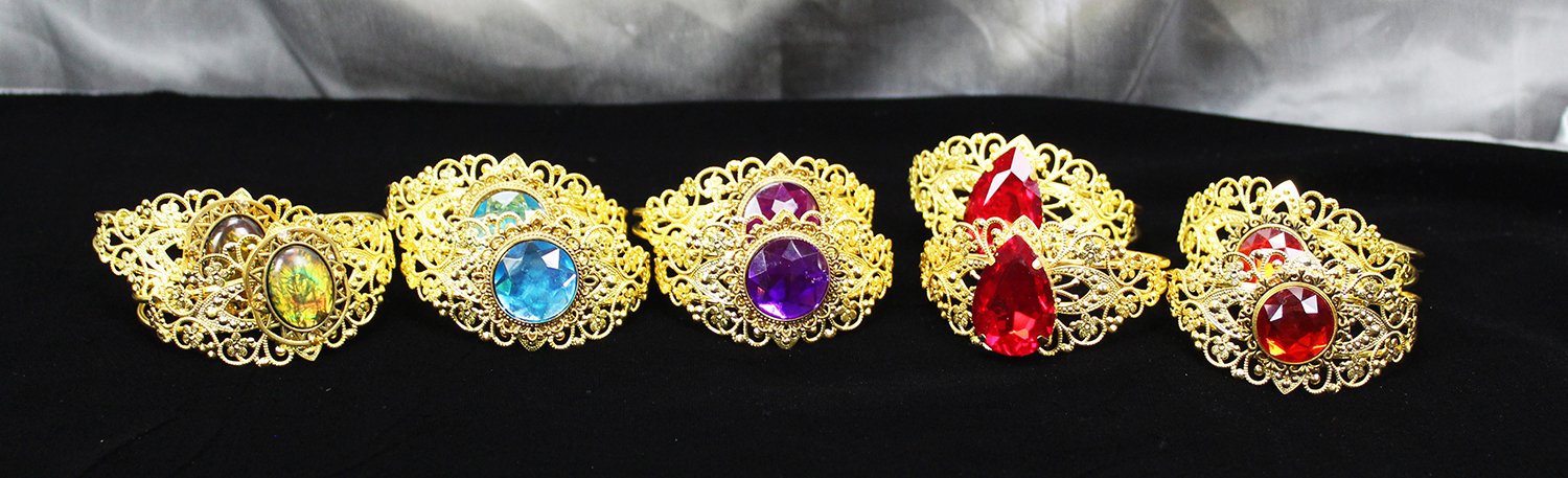 Gold and silver paint, tissue paper, acrylics, watercolors, textured paper, jewels, charms, metal objects.