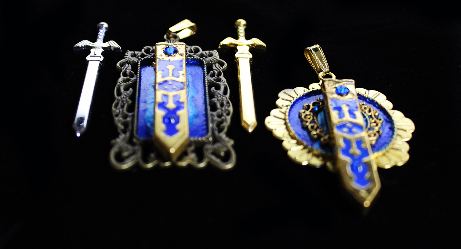 Gold and silver paint, tissue paper, acrylics, watercolors, textured paper, jewels, charms, metal objects.